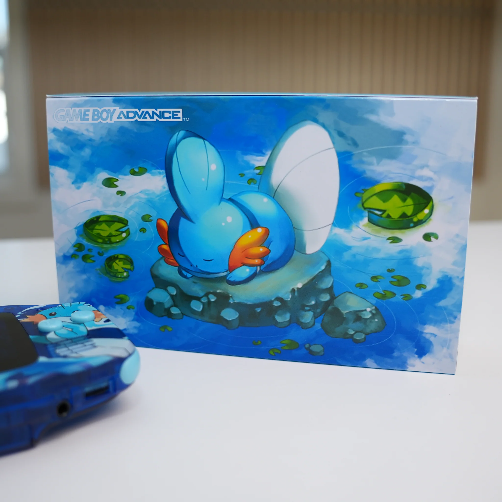 A custom Mudkip-themed Game Boy Advance featuring an IPS backlit screen, restored Nintendo internals, themed shell and buttons, and a matching collector box.